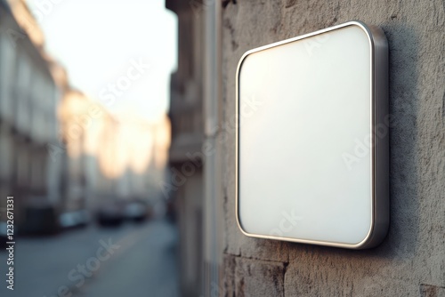 Blank Square Sign on Stone Wall: A blank square sign mounted on a weathered stone wall, with a blurred cityscape background, provides a simple, clean canvas for your message.