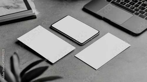 Blank stationery and a mobile device on a concrete surface.