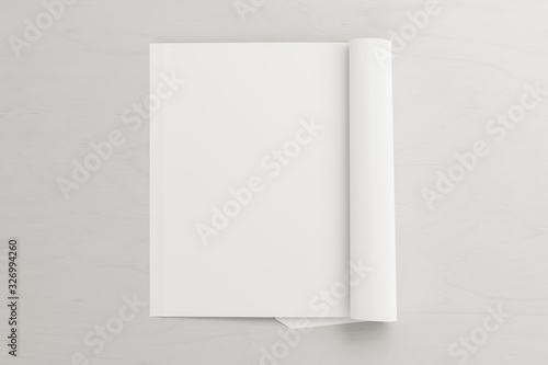Blank vertical left magazine page. Workspace with folded magazine mock up on white desk. View above. 3d illustration