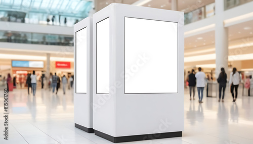 Blank white advertising flat mockup Kiosk display for advertisement at a shopping mall with blurred background and copy space, no humans