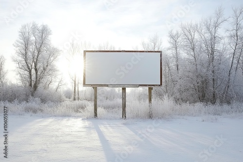 Blank white billboard in the middle of a snowy field surrounded by frost-covered trees and a bright sky.