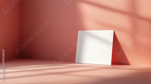 Blank white canvas leaning against pink wall with shadows and minimalist background