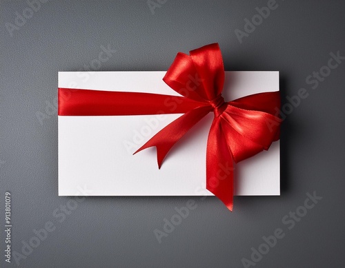 Blank white gift card with red ribbon bow isolated on grey background with shadow minimal design