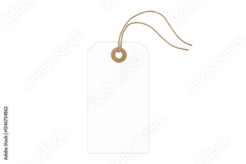 Blank white price tag hanging by brown string, featuring metal eyelet against transparent backdrop