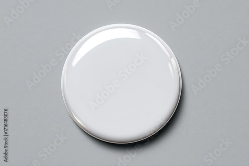 Blank white round badge on gray background. Glossy finish