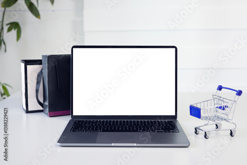 Blank white screen computer, mini shopping cart and shopping bags on table. Online shopping concept. Laptop mock up screen view.