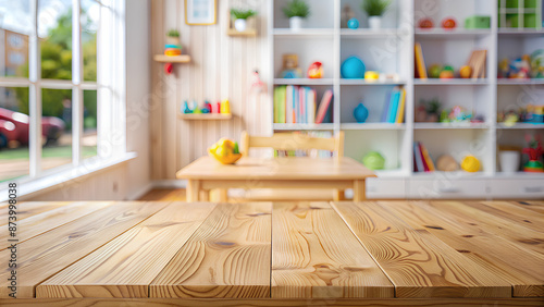 Blank wooden table top on blurred Interior of light playroom with toys in kindergarten background