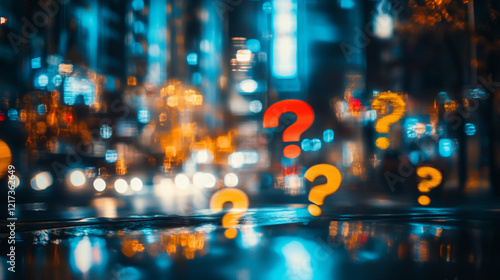 blend of question marks and blurred city lights, creating a captivating visual representation of intersection between modern technology and urban life cinematic view.