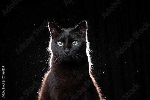 blind black cat portrait on black background in dusty backlight with copy space