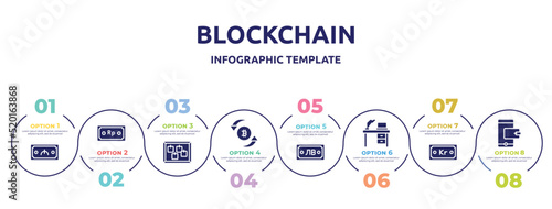 blockchain concept infographic design template. included manat, indonesian rupiah, cork board, trading, som, whiteboard, krone, digital wallet icons and 8 option or steps.