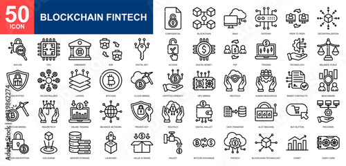 Blockchain Fintech icon set collection. Bitcoin, financial management, digital economy, digital currency, digital security icon. Simple line vector.