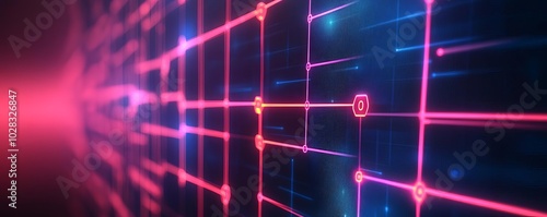 Blockchain innovation, hologram nodes, digital tech environment, neon accents