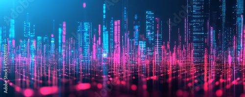 Blockchain interface, holographic data streams, futuristic cityscape, neon glow, digital transformation