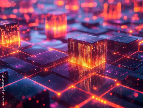 Blockchain solutions visualized with glowing digital blocks connected in a futuristic grid Futuristic Neon High Detail