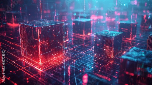 Blockchain technology represented by interconnected digital blocks, with a futuristic cityscape in the background, set in a high-tech environment with glowing neon accents and a dark backdrop