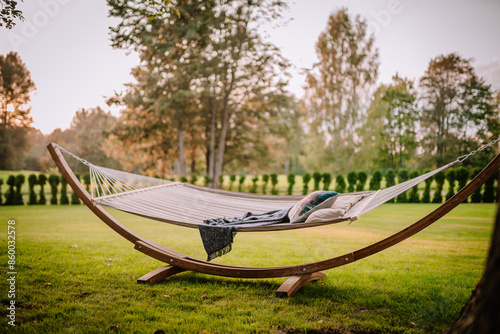 Blome, Latvia - September 11, 2023 - A hammock with pillows and a blanket on a green lawn, surrounded by trees and bushes, creating a peaceful outdoor relaxation spot. Copy space.