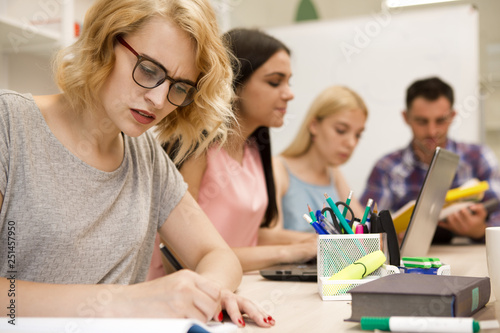 Blonde girl wearing in glasses sitting at table and writing lecture in notebook.