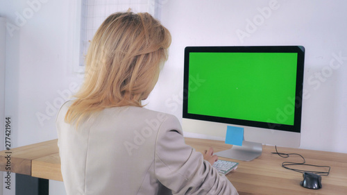 Blonde typing keyboard sitting at the working place with computer on the wooden desk display with green screen. Back view woman using pc in room with white wall