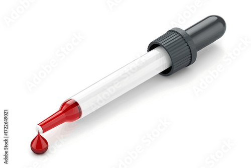 Blood Sample Drop Laboratory Precision Pipette Dropping Red Liquid Serum on White Surface.