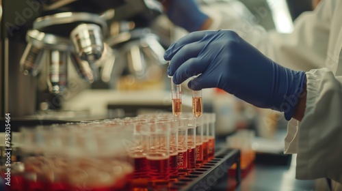 Blood Samples for Analysis. Lab technician with gloved hands is handling blood samples for analysis, emphasizing the careful procedures in medical diagnostics.