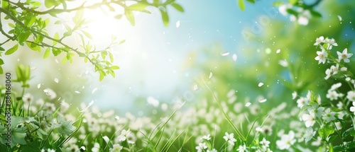 Blooming Beauty, abstract spring or summer background with fresh flowers and greenery, a lively and joyful atmosphere