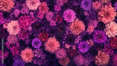 blooming bright pink and purple dahlias, creating a lively and colorful floral background. The design captures the essence of spring with a sea of flowers.