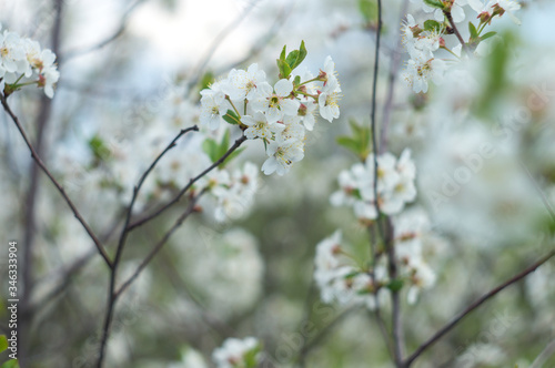 Blooming cherry orchards in May. White flower branch in spring, close-up selective focus