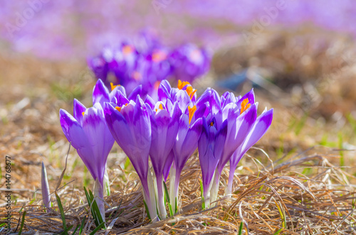 Blooming crocuses in spring, Chocholowska valley, Tatra mountains, Poland