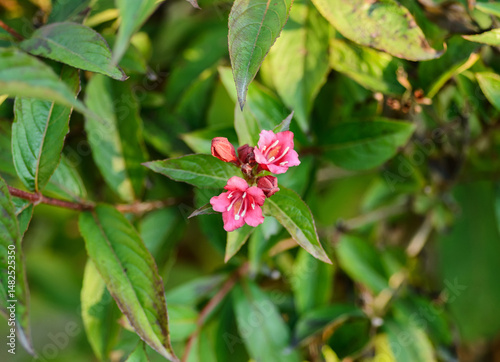 Blooming flowers of weigela. Shallow depth of field.