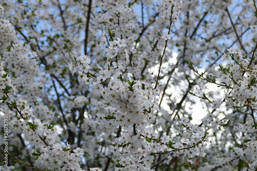 blooming fruit trees in spring, sparrow birds on flowering fruit trees,