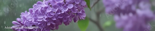 Blooming lilac branch, soft rain blurs background, delicate purple flowers glistening, floral, purple, nature