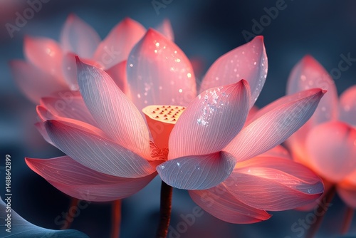 Blooming lotus flowers in serene water, illuminated by soft light during a peaceful summer evening