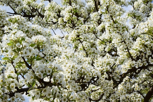 Blooming pear tree, pear blossoms background, pear white flowers, blooming tree background.