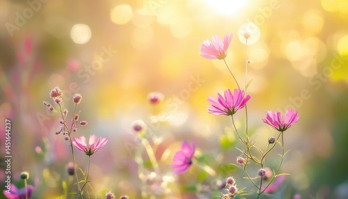 Blooming Pink Cosmos Flowers in a Field with Soft Bokeh Background Bathed in Warm Sunlight