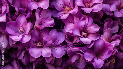 Blooming Purple Freesia flowers composition. A close-up view of vibrant purple flowers in full bloom, showcasing their delicate petals and intricate details.