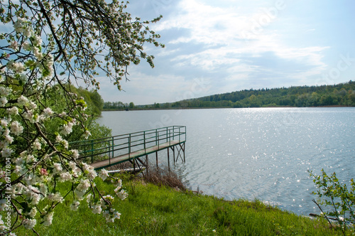 Blooming trees on a mountain lake in the open air against the background of the forest and mountains