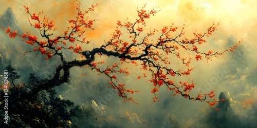 Blossom Tree in Foggy Mountains: Delicate cherry blossom branches stretch out against a backdrop of misty mountain peaks. The artistic render creates a serene and dreamlike landscape.