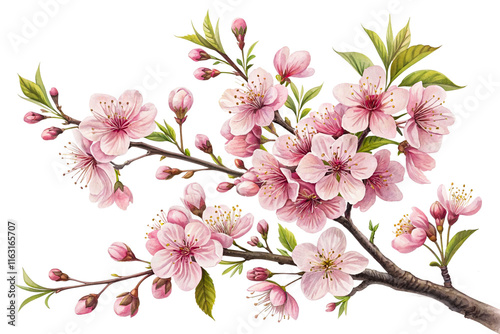 Blossoming cherry tree branch with delicate pink flowers and buds in spring isolated on transparent background