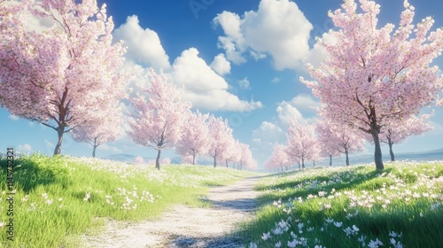 Blossoming cherry trees under a bright sky with fluffy clouds along a scenic path in springtime tranquility