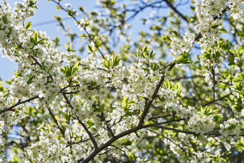 Blossoming of cherry flowers in spring time with green leaves and copyspace, macro