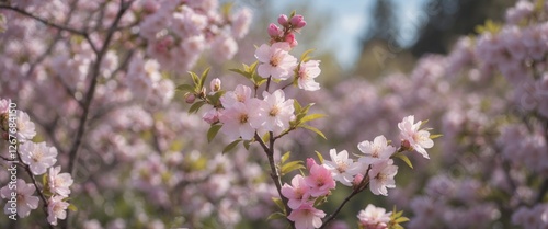Blossoming Pink Cherry Flowers In A Garden With Soft Focus Background And Space For Text or Design Elements