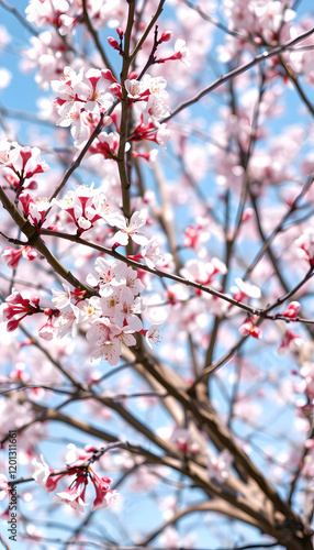 Blossoming tree branches with copy space banner spring time concept, hyperrealism, with white tones