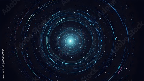 Blue abstract background with spiral pattern. Galaxies with stars and planets with circular motifs in deep blue lines of the universe night light space. No Generative AI