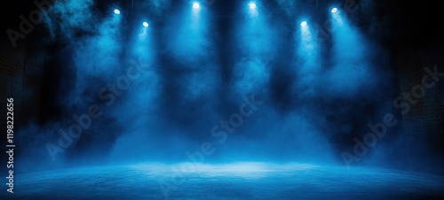 Blue Abstract Stage Setting with Smoke Spotlight and Neon Light for Display and Background