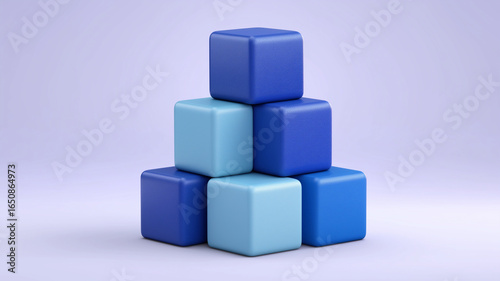 Blue and light blue cubes stacked in pyramid shape with smooth texture and soft lighting creating calm and balanced composition in minimalistic setting