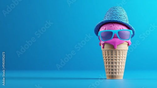Blue and pink ice cream cone with sunglasses and a blue hat on top. The ice cream is melting and dripping down the cone