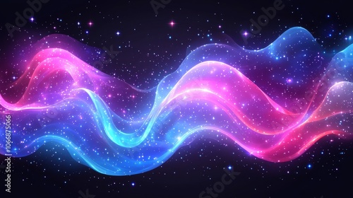 Blue and red wavy lines and colorful dots have been added to a dark blue background.