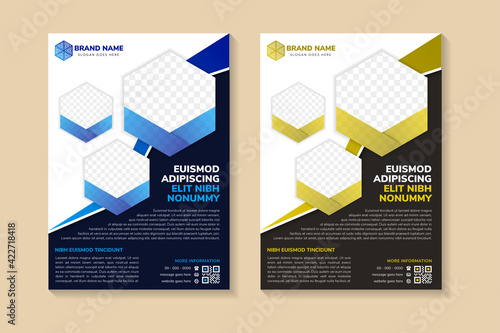 blue and yellow gradient flyer template design for business with hexagon shape for photo space. Multipurpose cover use vertical layout. dark and white background.