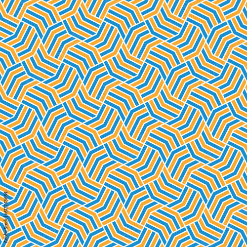 Blue and yellow striped squares on a white background. Diagonal zigzag lines. Seamless geometric pattern. Ethnic mosaic style. Abstract vector image for textile, fabric, wrapping, and print.