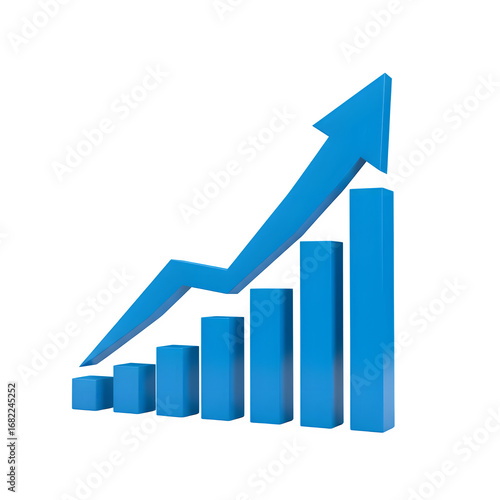 Blue arrow rising with bar chart showing financial growth, business success, and positive market trend. Isolated on white or transparent background. PNG format.